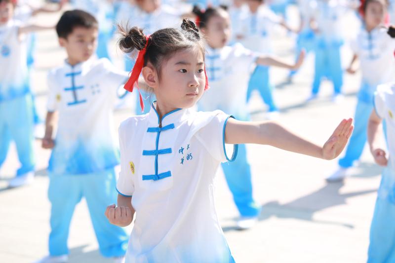 中国关工委常务副主任兼秘书长杨志海在致辞中强调,希望孩子们加强体育锻炼,积极学习传承中华武术文化,传播武术理念,弘扬武学精神!中国关工委常务副主任兼秘书长杨志海、北京奥运城市发展促进会副会长、原北京市政协副主席王伟大会上共同为雄狮点睛。教育部关心下一代工作委员会常务副主任王富,北京市朝阳区教委副主任孙逊出席活动并讲话。中国关工委副秘书长朱萍、副秘书长郝毅、办公室主任陈江旗,北京市关工委副主任赵东鸣、秘书长腾毅,北京市教育关工委主任张雪、副主任线长久,中国关工委健体中心名誉主任曹秀云,中国关工委健体中心主任郝锐等领导出席活动并为优秀代表颁奖。新华社、人民日报、中央电视台、中国教育电视台、北京电视台等在京主流媒体和社会各界在爱心人士代表、大会形象大使代表共同参加了开幕仪式。参会嘉宾与千名儿童进行现场互动,共同参与习练武术抱拳礼、冲拳和推掌等动作,现场感受武术文化和习武健体强身带来的快乐和健康魅力。