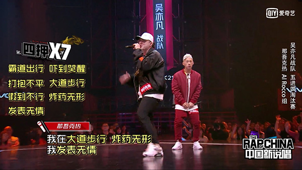 自此,三组制作人的战队集结战正式结束,即将开启的是更为残酷的队内5进4淘汰赛。在制作人公演中实力夺冠的吴亦凡,其“梦之队”同样名不虚传。以英文说唱见长的AlRocco,为了弥补自己中文不好的劣势,努力学习的同时更是在歌曲细节上十分用功。作为搭档,十分喜欢AlRocco的那吾克热在赛前坚定表示:“必须得赢!”果不其然,那吾克热凭借四押X7的“疯狂”押韵技巧,被网友评为“确认过眼神,是吃了新华字典的人”,而二人也成为全场唯一让三组制作人起立鼓掌的小分队,就连隔壁的G.E.M.邓紫棋都毫不掩饰地称赞道:“他们就是典型的1+1=3!”