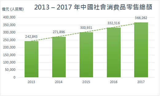 随着中国经济腾飞,都市化发展持续,中产阶级快速崛起,市民收入按年增长,购买力也不断增强。中国消费市场规模以年均10%的速度成长,位居全球之冠,而2017年中国社会消费品零售总额更高达36.6万亿元,与消费大国美国基本持平,预计到2021年,中国消费市场将扩大近一半,达到6.1万亿美元的规模。其中,上层中产和来自富裕家庭的消费者倾向选购设计现代、质量优越、持久耐用的家居及时尚用品,而年轻一代的消费需求更趋品味化和多样化,且追捧潮流科技和创新产品,为各式各样的进口优质生活用品带来庞大的市场需求和机遇。