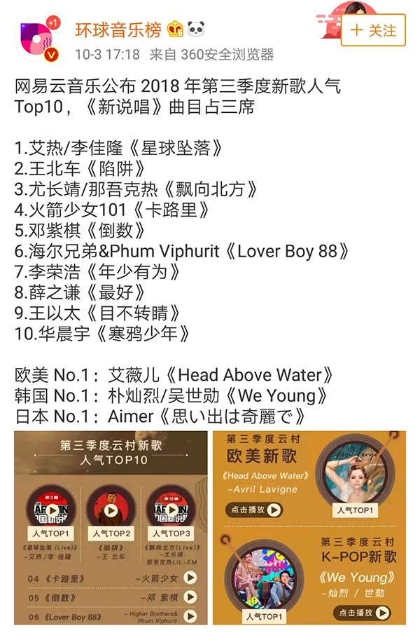 作为一档华语青年说唱音乐真人秀,为观众输出更多“洗耳”金曲成为本季节目不可不提的重要贡献之一,如《星球坠落》、《目不转睛》、《乌云中》、《飘向北方》、《Three Pass》等优秀作品都在多个音乐平台持续霸榜。其中《星球坠落》更是一跃跻身抖音最火BGM,《目不转睛》持续一个月登顶抖音音乐榜TOP1。同时,在网易云音乐公布的第三季度新歌人气TOP10中,《中国新说唱》的曲目占了三成,这份成绩在所有音乐类综艺中实属出类拔萃。