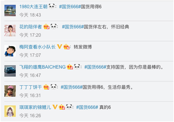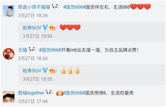 这种以爱国情怀引发的刷屏级话题讨论,也是自然而然的现象。有国才有家,每个人对国家都怀有一颗敬畏之心,从爱国产电影到爱国货,让人为之一振,而#国货666#这一话题,也成功挑起用户对国货的荣耀感,对国家的自豪感。哈弗M6这种以小博大,玩转国货情怀营销还是很值得借鉴的!