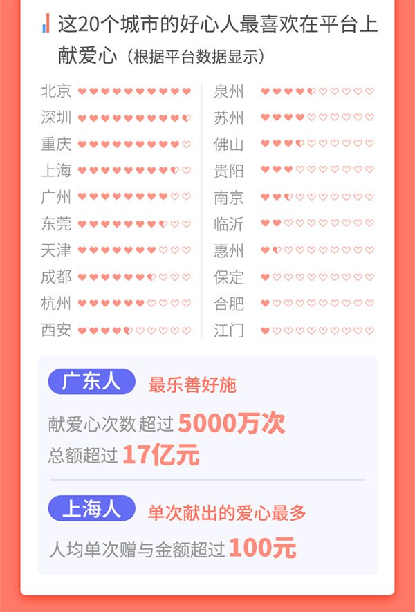 数据显示,广东、浙江、江苏、山东、四川、河南、福建、湖南、河北、北京这十个省份是最乐善好施的省份,而以城市维度,北京、深圳、重庆、上海、广州、东莞、天津、成都、杭州、西安、泉州、苏州、佛山、贵阳、南京、临沂、惠州、保定、合肥、江门这二十个城市爱心救助人次排在前列。