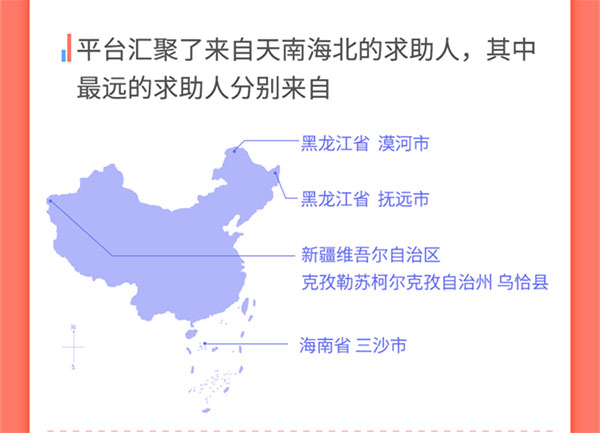 目前水滴筹已经覆盖中国400多个城市,其中包括中国最东端的黑龙江省抚远市,最南端的海南省三沙市,最西部的新疆维吾尔自治区克孜勒苏柯尔克孜自治州乌恰县,最北端的黑龙江大兴安岭地区的漠河市都有求助者。