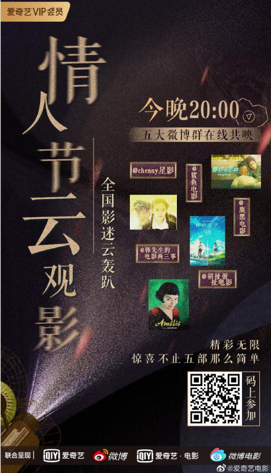 今年情人节,爱奇艺电影联合微博电影贴心搭建了五个“线上虚拟情人节影院”,诚邀五位资深电影博主在影迷粉丝群内观看了三部爱情佳片,满足了影迷一边看电影一边实时互动的“云”需求,情侣们足不出户就可以拥有甜蜜的浪漫,单身贵族也聚在一起得到了心灵慰藉。除此之外,爱奇艺电影还联合毒舌观影团发起“万人云观影”活动,更是为全国各地的影迷们打造了一场线上电影狂欢。知名影评人菊椒男孩空降直播间,以其专业的影评见解、强大的话题控场能力,引发网友们的热烈好评。