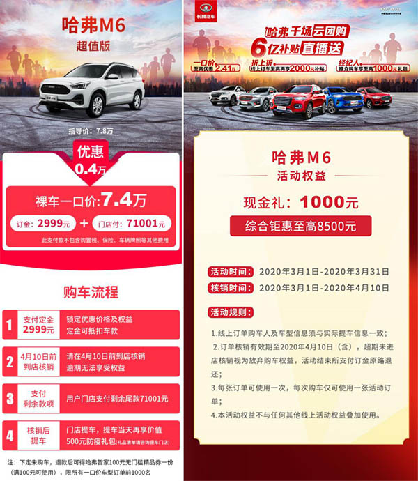 疫情期间,哈弗特推出了“哈弗千场云团购 6亿补贴直播送”线上团购活动,线上订购售价7.8万元的哈弗M6超值版,参与“好车一口价”活动可直接优惠0.4万,或线上购买哈弗M6参与“好车折上折”活动,综合钜惠至高8500元,还有1000元现金礼,如此优惠力度和直播购车方式,更多保障和优惠满足消费者疫情期间安全看车、购车需求,哈弗M6这波操作走心了。