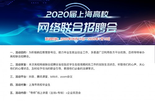 为积极响应教育部号召,助力毕业生就业创业工作,多渠道广泛利用各方平台优势,百师导特举办“职海茫茫·毕业实习第一站——2020年百师导首届上海市高校毕业生网络联合招聘会”活动,旨在贴近学生在疫情期间找工作的实际生活,听取他们的心声,关心他们的心理状态,及时给予恰当的引导,教授他们必备的法律常识,以闯关打卡符合他们年龄特点的线上活动形式,调动他们的积极性,以收集学生工作情况为开端,以如何快速的找到适合的工作为内容,以协助学生上岗为最终目的,开展了为期1个月的活动。