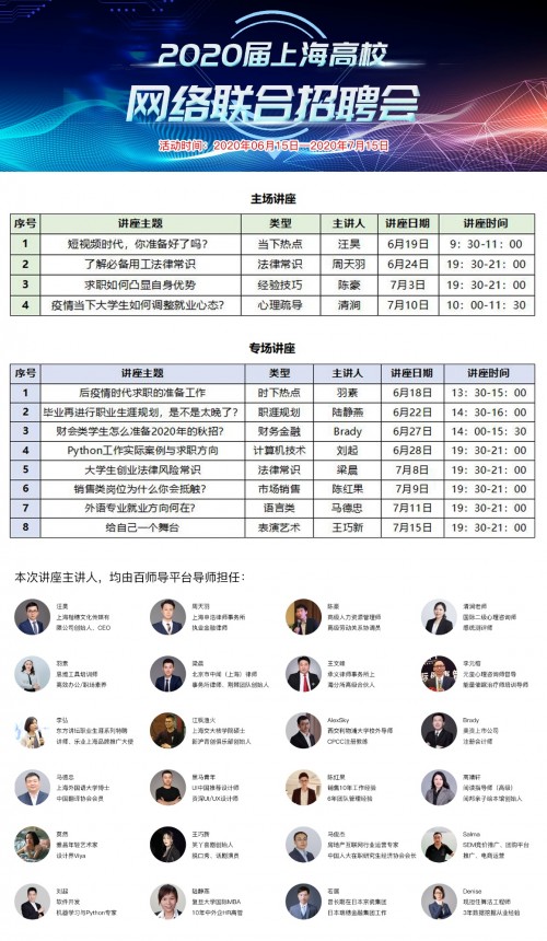 本次活动感谢上海人才服务行业协会、上海学生事务中心、16所高校、各大合作媒体以及百师导平台导师等社会各界团体与个人的大力支持与配合。