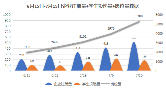图表1:6月15日-7月15日企业注册量+岗位投递量