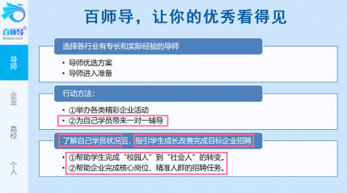 本次活动期内,讲座前中后过程中,平台与导师都与毕业生、实习生进行了充分的互动与答疑,导师在百师导平台中的作用,也日渐凸显,学生吸收着导师的引导与内容分享,给予导师以认可与信任,导师传导经验与指导,最终助推学生拿到企业offer,顺利上岗。