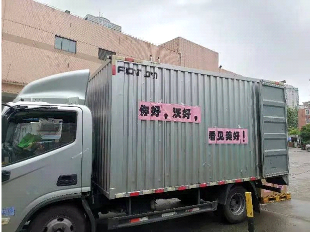 也许是一种巧合。我们在运输车的外面,张贴的标语就是“你好,沃好,看见美好”。